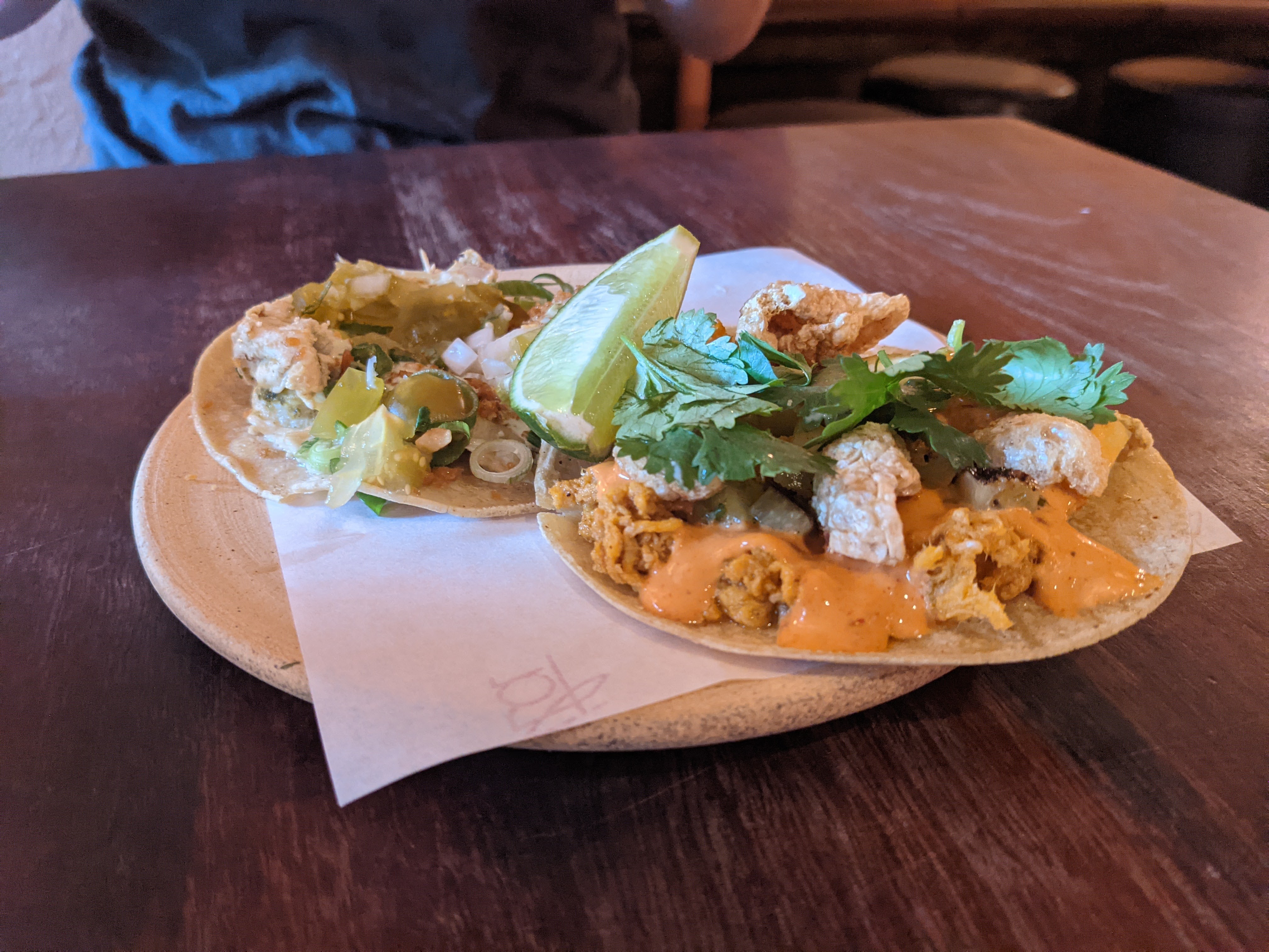Depsite staff being light on they were enthusiastic and asked about how the meal was going, etc. It was more they just couldn’t get to everyone. Otherwise the place felt a little more casual restaurant than bar at the time we went, around 7ish. It was relaxed, not too full but not empty with a constant stream of people buying food and drinks. We booked but I don’t think there was a need too. But I imagine it would be a very different place later in the week and later in the night. It also could just be ‘covid inflation’ but we came away thinking it was all a bit pricey. The food was good not great, for example with the tacos while they were pretty tasty it felt bad paying $9 for a small taco.